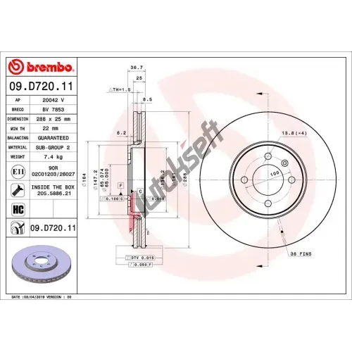 Informace o montáži: Important: Observe Fitting Instructions ATE ‐ Brzdový kotouč - 288 mm AT 425220