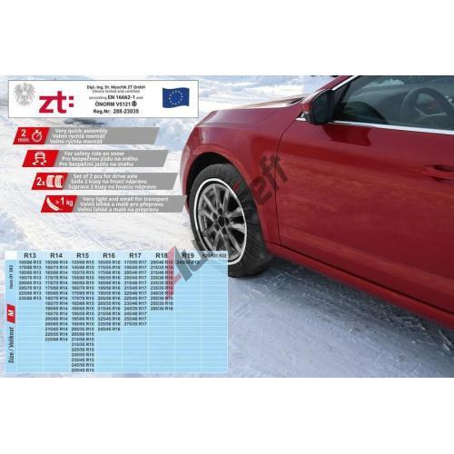 Textilní sněhové řetězy, s velmi rychlou a snadnou montáží, splňují evropské normy včetně v Rakousku vyžadované ÖNORM V 5121. Řetězy jsou vyrobeny z vysoce odolné technické tkaniny a jsou vhodné pro veškeré osobní automobily, včetně vozů SUV a vozidla s pohonem 4x4. Díky hluboké struktuře povrchu je zajištěna bezpečná jízda na sněhu a na ledu. Vrchní strana je opatřena šipkou pro správný směr a orientaci na pneumatice. Řetězy jsou opětovně použitelné. Oproti běžným kovovým řetězům vynikají textilní řetězy svou nízkou hmotností i perfektní skladností a navíc nepotřebují žádnou zvláštní údržbu. Po použití stačí nečistoty opláchnout pomocí vlažné vody a nechat osušit. Díky svým malým rozměrům nebudou řetězy zabírat mnoho místa ve vozidle. Balení obsahuje sadu na nápravu (2 ks textilních řetězů), pár igelitových rukavic s dlouhým rukávem a návod k použití.