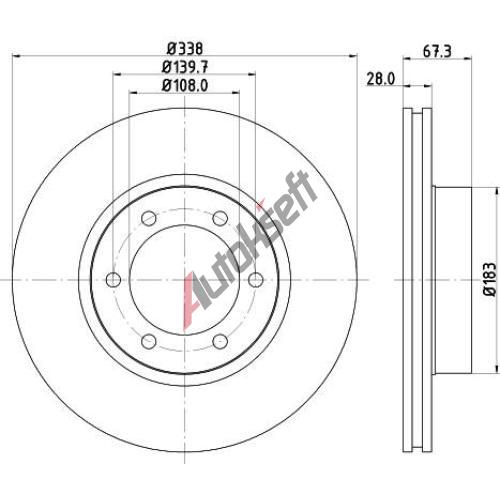 Srovnávací průměr: 338Vnější průměr [mm]: 338Síla brzdového kotouče [mm]: 28Minimální tloušťka [mm]: 26Výška [mm]: 67,3Ráfek, počet děr: 6Typ brzdového kotouče: chlazenýCentrovací průměr [mm]: 108Kruhový vývrt ∅ [mm]: 139,7Povrch: nátěrPrůměr náboje [mm]: 183Hmotnost [kg]: 9,4EAN:8717109256215TOYOTA43512-60150 (4351260150)43512-60151 (4351260151)LEXUS43512601514351260160Konkurenční kódy