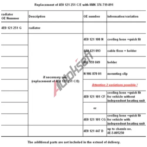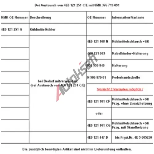 | Doplňkový potřebný díl (výrobek - číslo): | 4E0 121 101CF/CG |