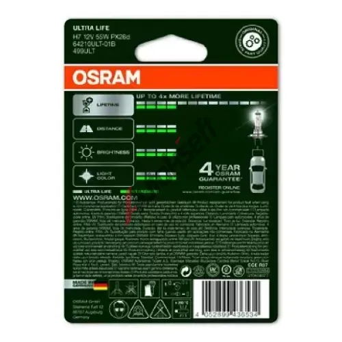 Autožárovka OSRAM ULTRA LIFE je favoritem pokud se jedná o odolnost. Žárovky mají až čtyřikrát delší životnost ve srovnání se standardními žárovkami a provozní životnost až 100,000 km (s průměrnou roční najetou vzdáleností 14,259 km a zapnutými světly na 60 %). Žárovky ULTRA LIFE mají moderní design se stříbrným vrchlíkem (H4/H7/H11). Proto jsou ideální pro řidiče, kteří jezdí denně, nebo pro osoby, které je používají pro denní svícení. Jsou vhodné pro čiré světlomety.