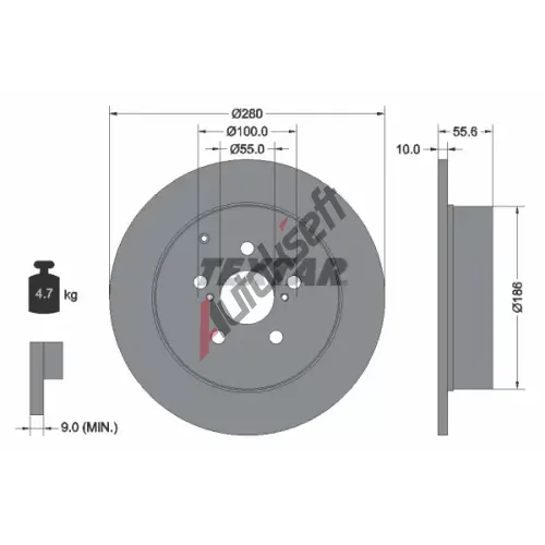 Srovnávací průměr: 280Vnější průměr [mm]: 280Síla brzdového kotouče [mm]: 10Minimální tloušťka [mm]: 9Výška [mm]: 55,6Ráfek, počet děr: 5Typ brzdového kotouče: plnýCentrovací průměr [mm]: 54,8Kruhový vývrt ∅ [mm]: 100Povrch: nátěrPrůměr náboje [mm]: 186Hmotnost [kg]: 4,76EAN:8717109257465TOYOTA42431-05030 (4243105030)424310506042431YZZAAKonkurenční kódy