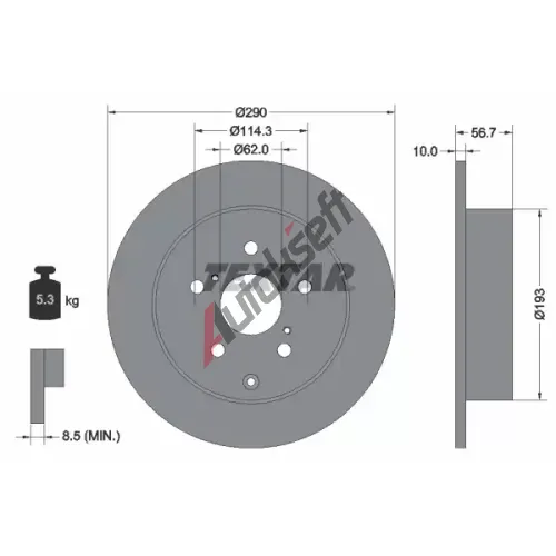 Srovnávací průměr: 290Vnější průměr [mm]: 290Síla brzdového kotouče [mm]: 10Minimální tloušťka [mm]: 8,5Výška [mm]: 57Ráfek, počet děr: 5Typ brzdového kotouče: plnýCentrovací průměr [mm]: 62Kruhový vývrt ∅ [mm]: 114,3Povrch: nátěrPrůměr náboje [mm]: 193Hmotnost [kg]: 5,23EAN:8717109372038TOYOTA42431-0F010 (424310F010)Konkurenční kódy