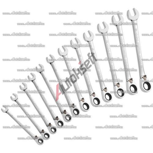- ISO 691 - ISO 1711-1, - Pracovní úhel ráčnového mechanismu (úhel kroku zpětného chodu) 5°., - 12 - ti hranné očko vyhnuté 15°., - Ústí klíče vykloněné o 15° od osy těla klíče (pracovní úhel 30°)., - Profil očka zajišťuje maximální styčnou plochu přenosu síly na matice, pro prodloužení životnosti klíče., - Vykované z chrom-vanadové oceli., - Chromovaný leštěný povrch.